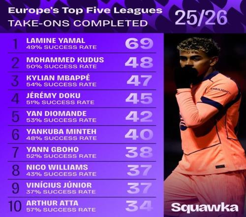 本賽季至今五大聯(lián)賽成功過人榜:亞馬爾69次居首,庫杜斯第二
